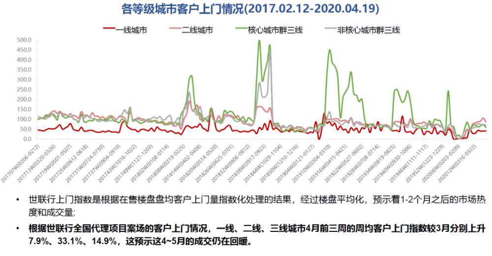 下图是世联行在各城市售楼处,客户上门实时看房人数的变化。我们发现一二三线城市,4月份前三周的周均上门量分别比3月份还高,二线城市提高了33%,三线城市提高了15%。这预示着这个小阳春还没结束,如果客户都开始上门看房了,预示着需求依然蓬勃。