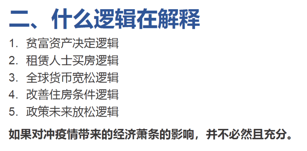 但这五个逻辑并不足以对冲经济下滑,收入减少的现实情况。我们还得讲一下疫情给住宅带来的独特逻辑。