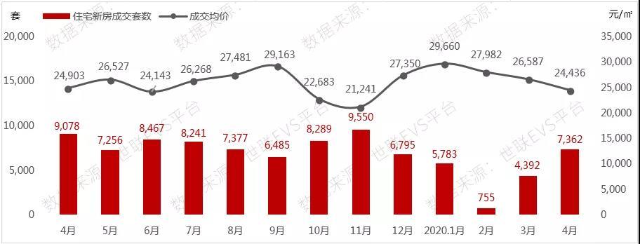 2020年4月,根据世联评估EVS监测,广州市商品住宅成交套数7,362套,环比上涨67.62%,同比下滑18.9%;成交面积79.80万平方米,环比上涨66.28%,同比下滑16.86%;成交均价24,436元/㎡,环比下滑8.09%,同比下滑1.88%。广州全市存量住宅成交均价与上月基本持平,成交均价为28,309元/㎡,同比下跌1.68%;环比微跌0.20%,总体趋于平稳,维持高位稳定状态。