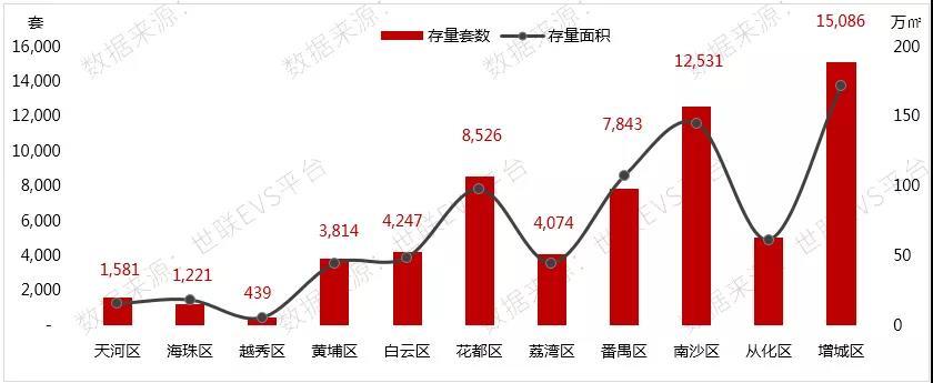 截至2020年4月底广州商品住宅存量面积和套数区域分布图