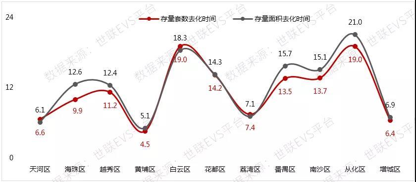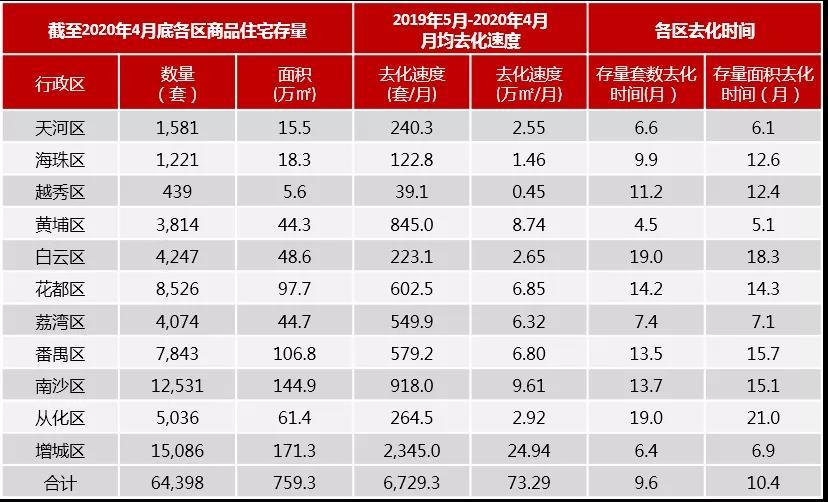 截至2020年4月底广州各区存量商品住宅去化时间(月)图