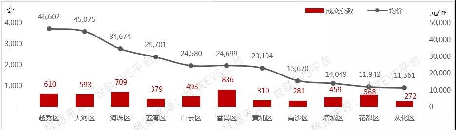 成交面积47.83万平方米,环比大幅上涨272.51%,同比上涨4.0%;成交区域主要集中在番禺区、海珠区以及越秀区,全市十一区成交套数及面积环比集体大幅上涨,其中白云区成交套数环比上涨幅度最大,达378.64%。