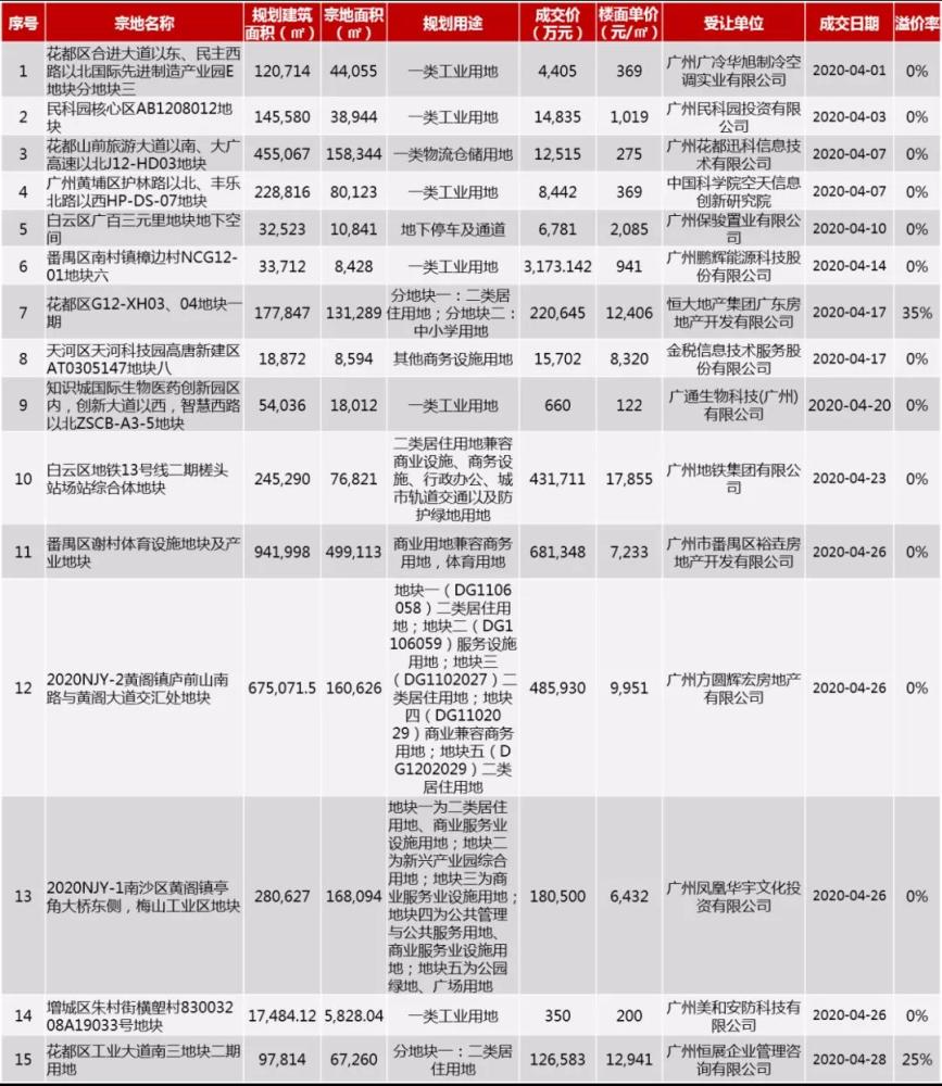 商服用地本月全市共成交2宗,分别位于天河区和番禺区,成交面积50.77万㎡,占全市总成交面积的34.39%,成交金额达69.71亿元;工业用地本月全市成交7宗,成交面积35.36万㎡,占全市总成交面积的23.95%,成交金额达4.44亿元。