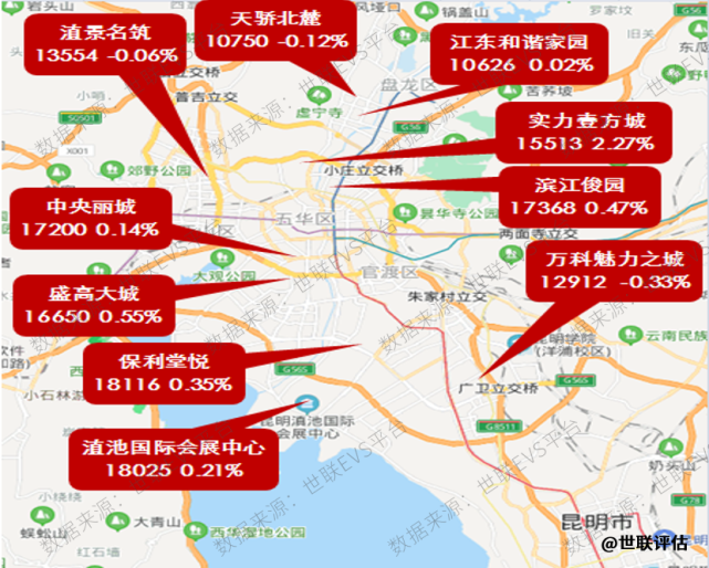 从各主城行政区均价环比监测结果来看,市场波动平稳,本月昆明总体呈小幅上涨趋势,西山区在五个主城区中仍居于高位,五华区和盘龙区紧追其后,其次是官渡区,最低是呈贡区。